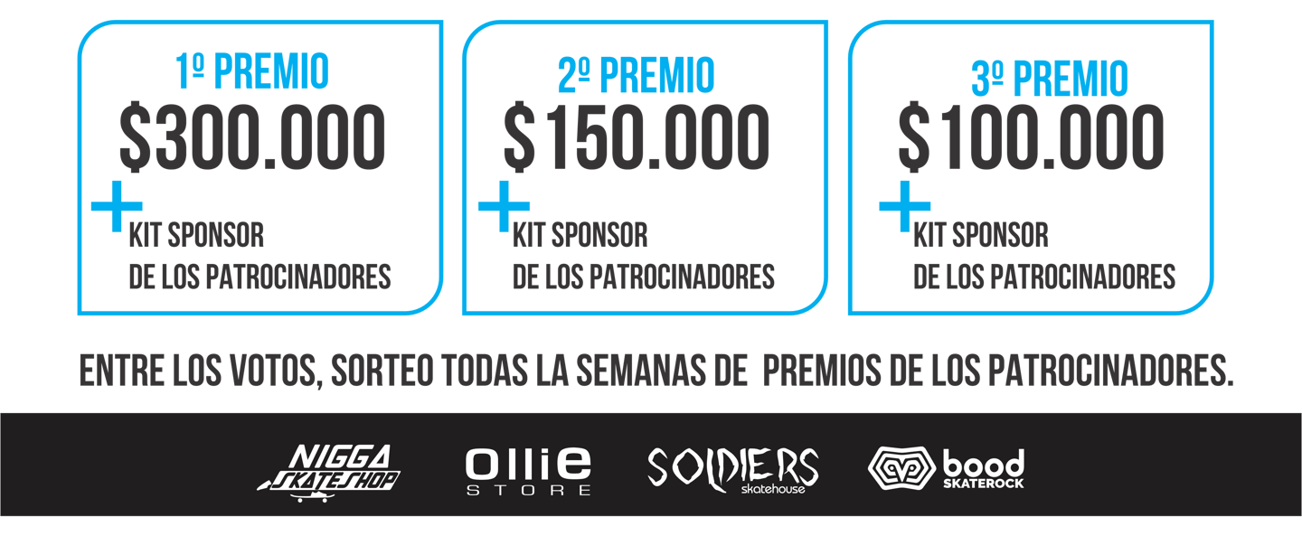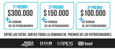 ENTRE LAS PERSONAS QUE VOTEN, SE SORTEAN TODAS LAS SEMANAS PREMIOS INCREIBLES DE LOS PATROCINADORES. MUCHOS PREMIOS SORPRESA DURANTE LA DURACION DEL OPEN ONLINE SKATEBOARDING ¨SPONSOR ME¨